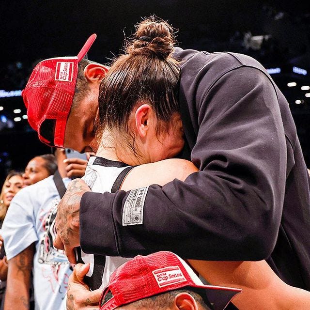 And the award this week goes tooooooo: TWO-TIME WNBA CHAMPION KELSEY PLUM of the Los Vegas Aces and her husband of the NY Flops Giants, Darren Waller. We came across this photo from last year of them hugging after Kelsey won the WBNA championship for the second time in a row(!!!), and we’re crying at how cute they are. Their support for each other is what Hallmark movies are made of, with both of them talking about how long-distance (her team is in Vegas and his in NY) has made them better communicators and more attentive partners. Sweetie pies!
