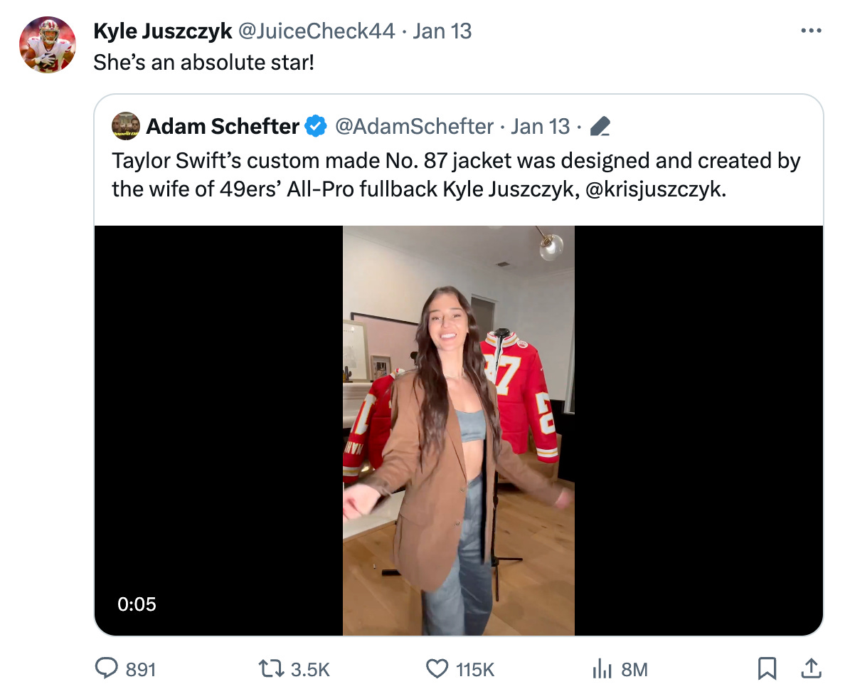 Most supportive husband award goes to Kyle Juszczyk (Kristin’s husband), who was literally all over Twitter commenting and making sure everyone knew who made Taylor’s jacket. <3333
